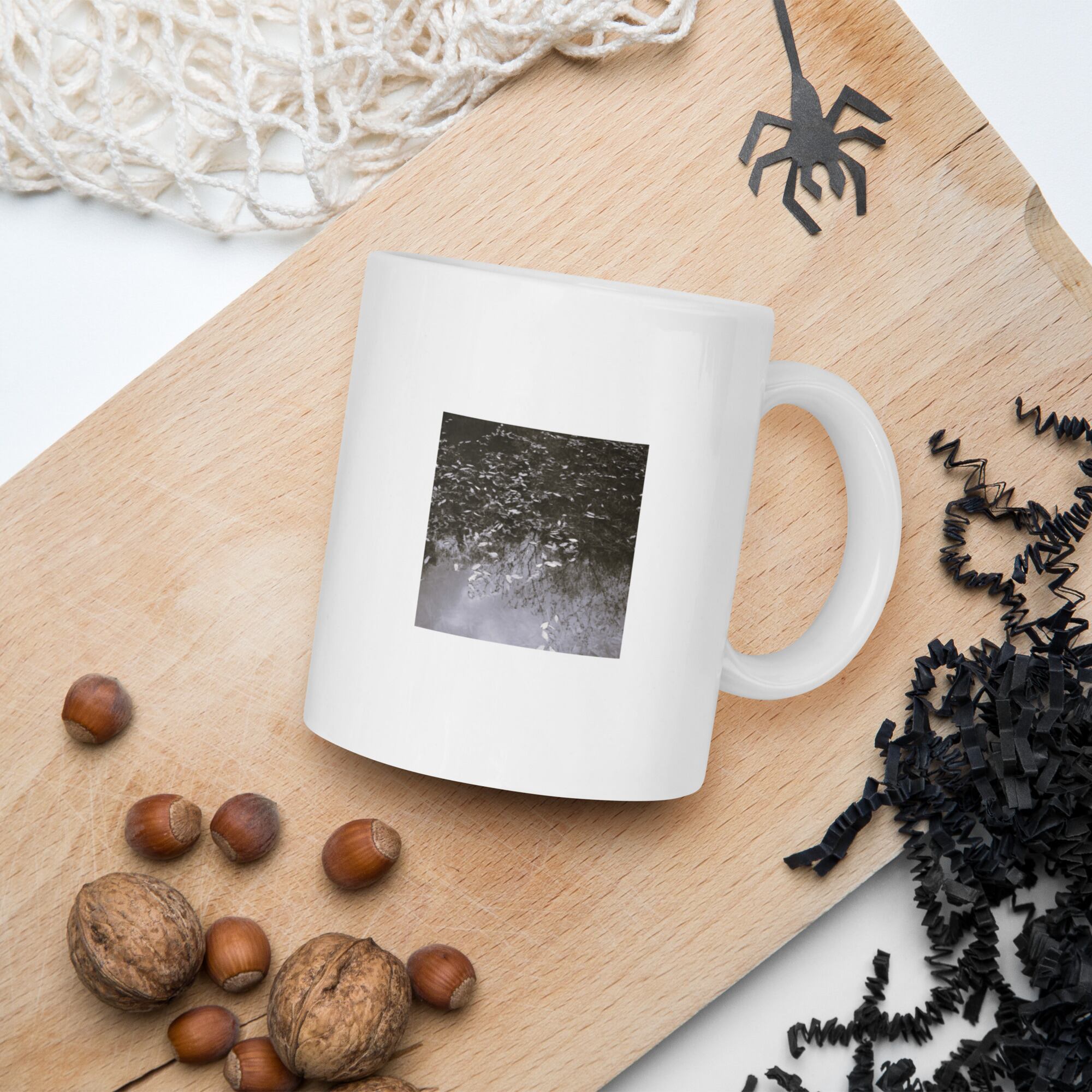 池に落ちた葉と水面に映った木のモノクロ写真のデザインの商品です。