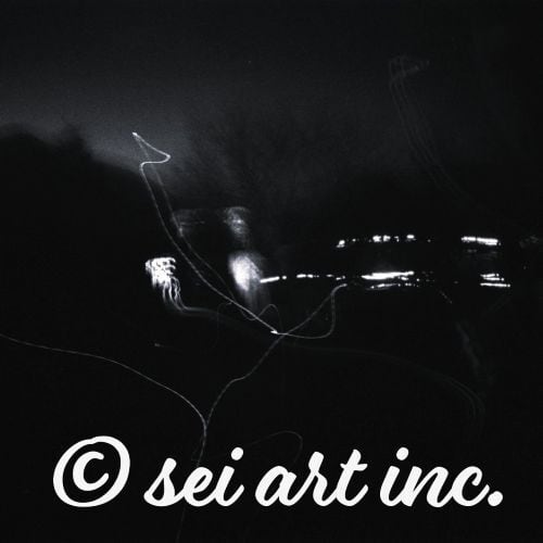 闇に浮かぶライトを映した写真(モノクロ)のデザインの商品です。
