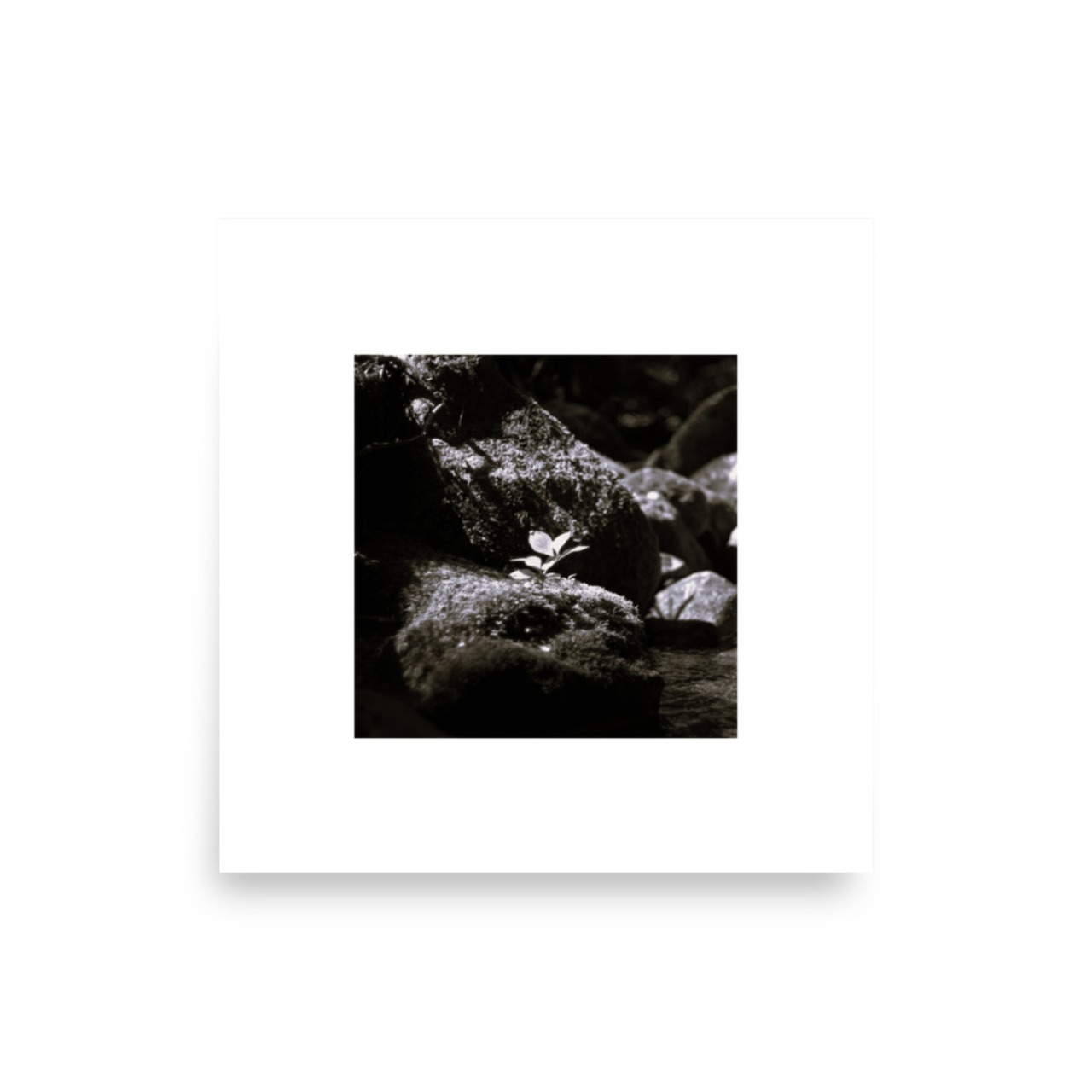 苔むした岩の上の植物をうつした写真(モノクロ)デザインの商品です。