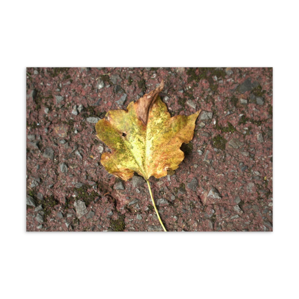 道路に落ちた一枚のカエデの葉を写した写真デザインの商品です。