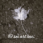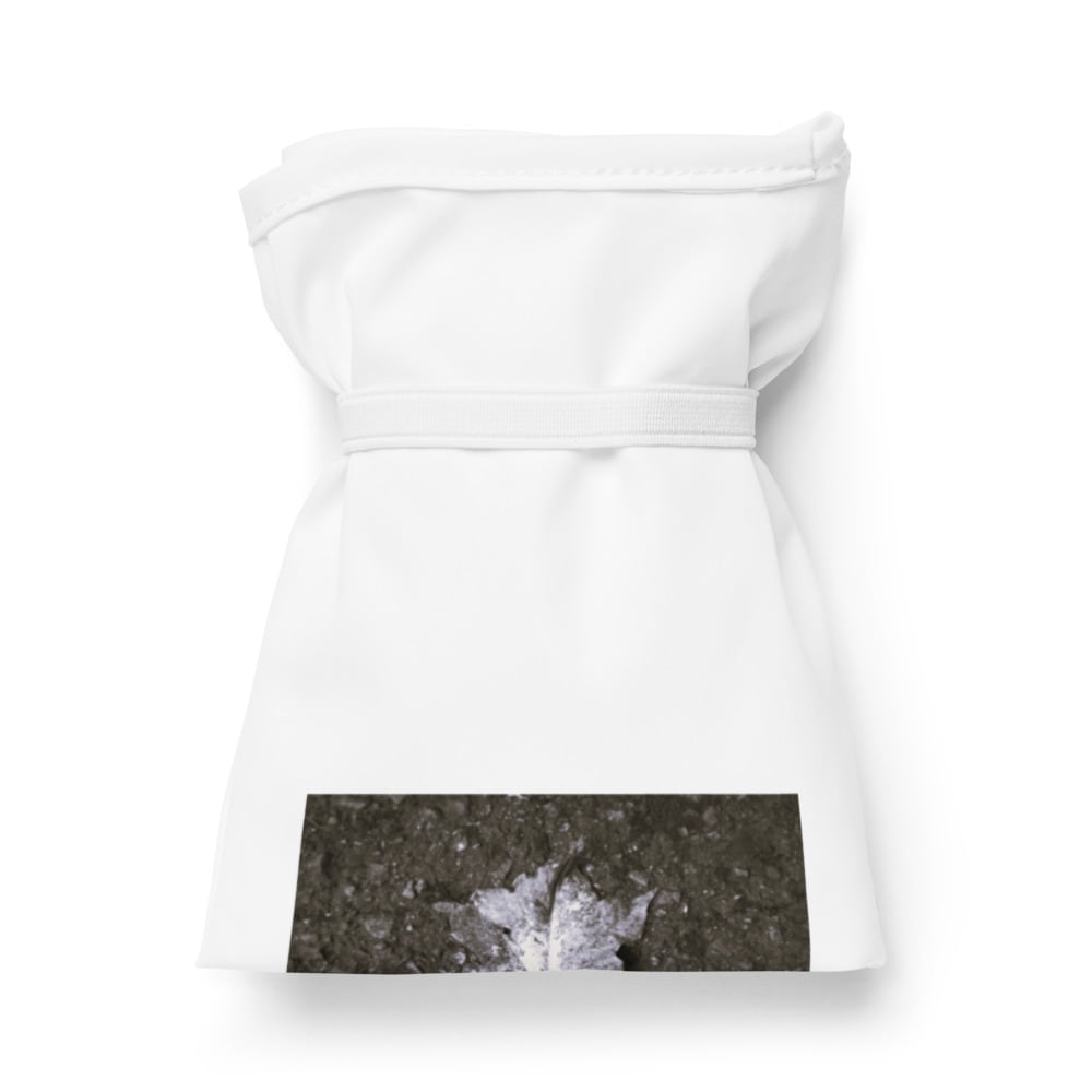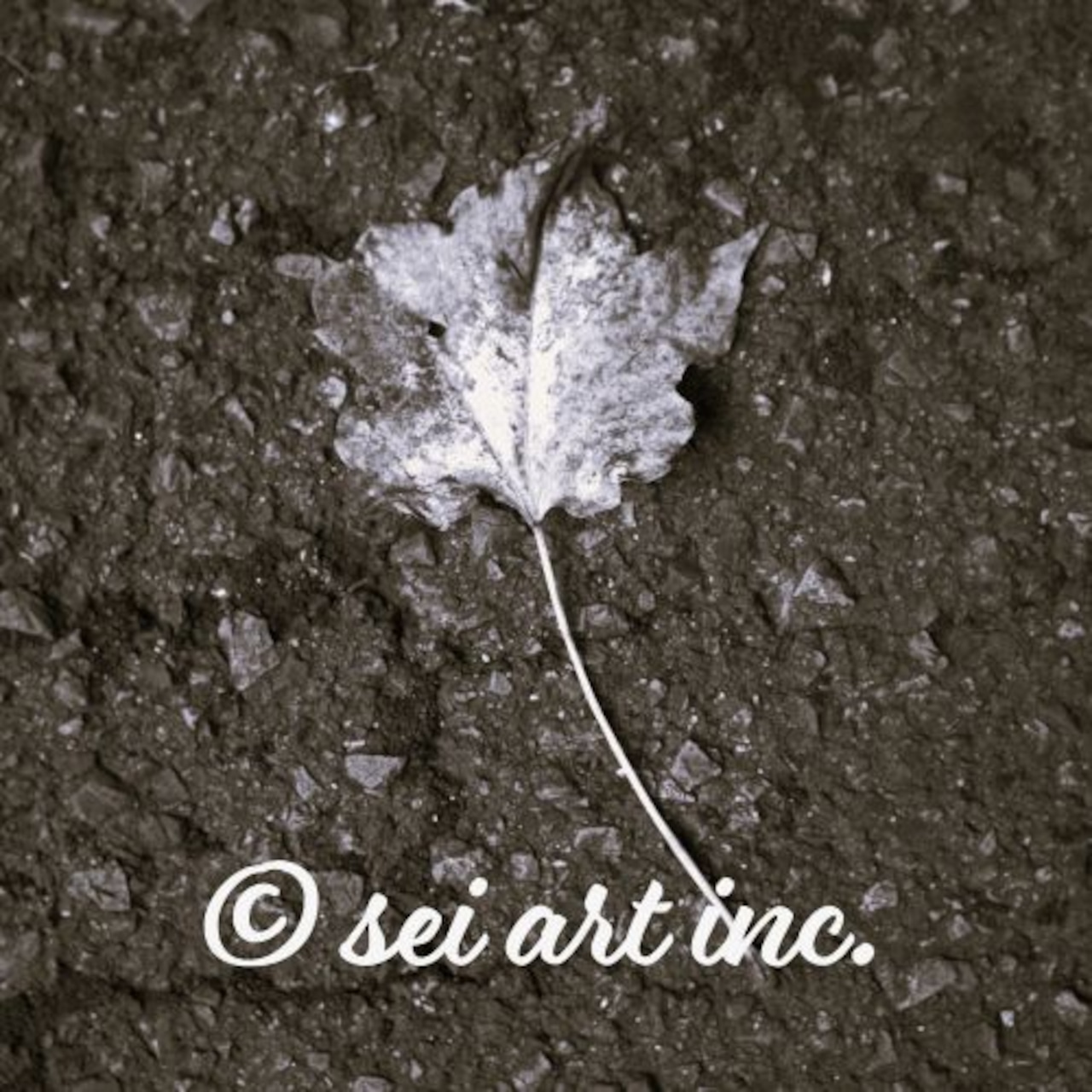 道路に落ちた一枚のカエデの葉を写した写真(モノクロ)デザインの商品です。