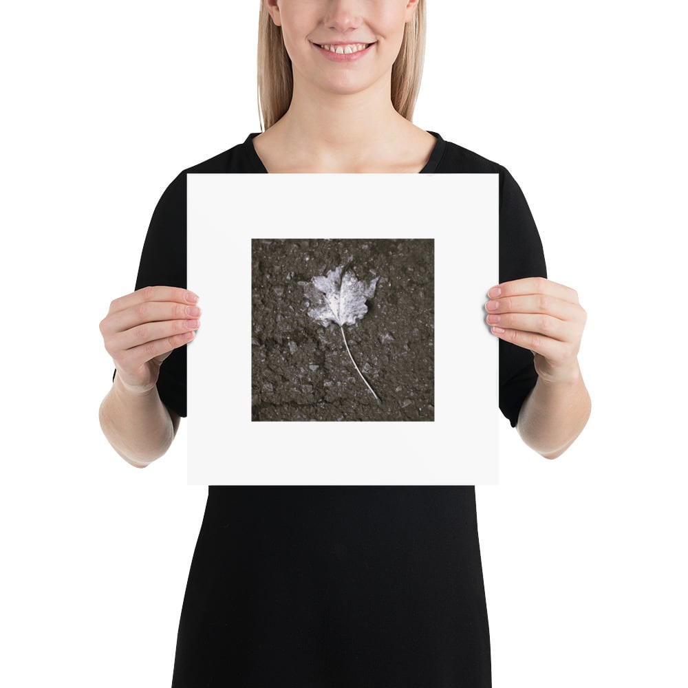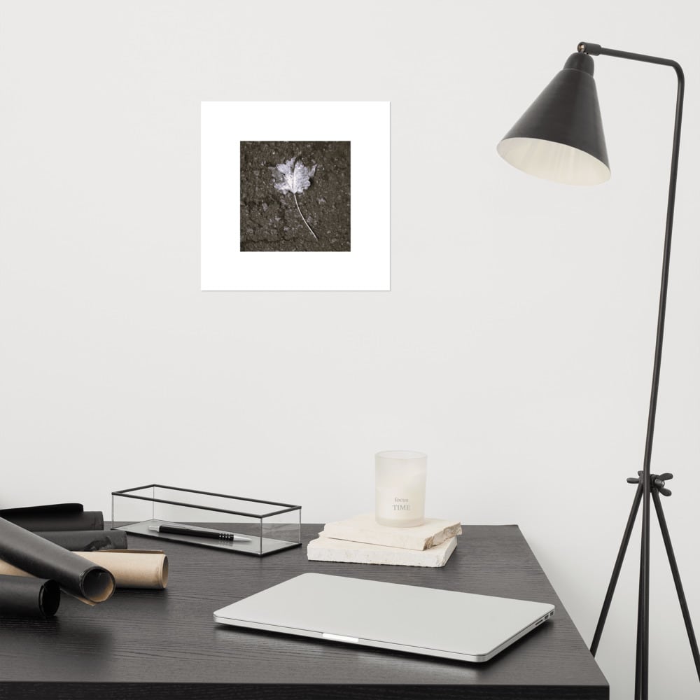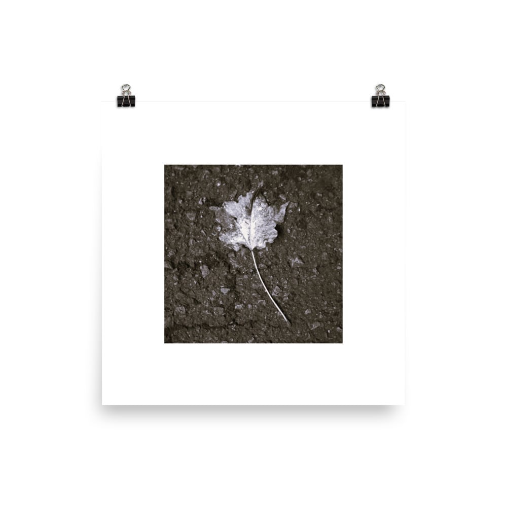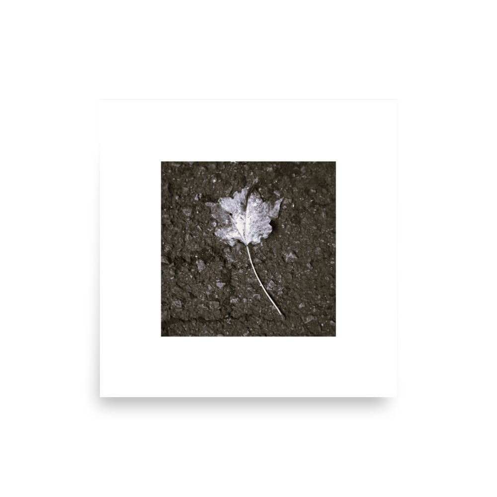道路に落ちた一枚のカエデの葉を写した写真(モノクロ)デザインの商品です。